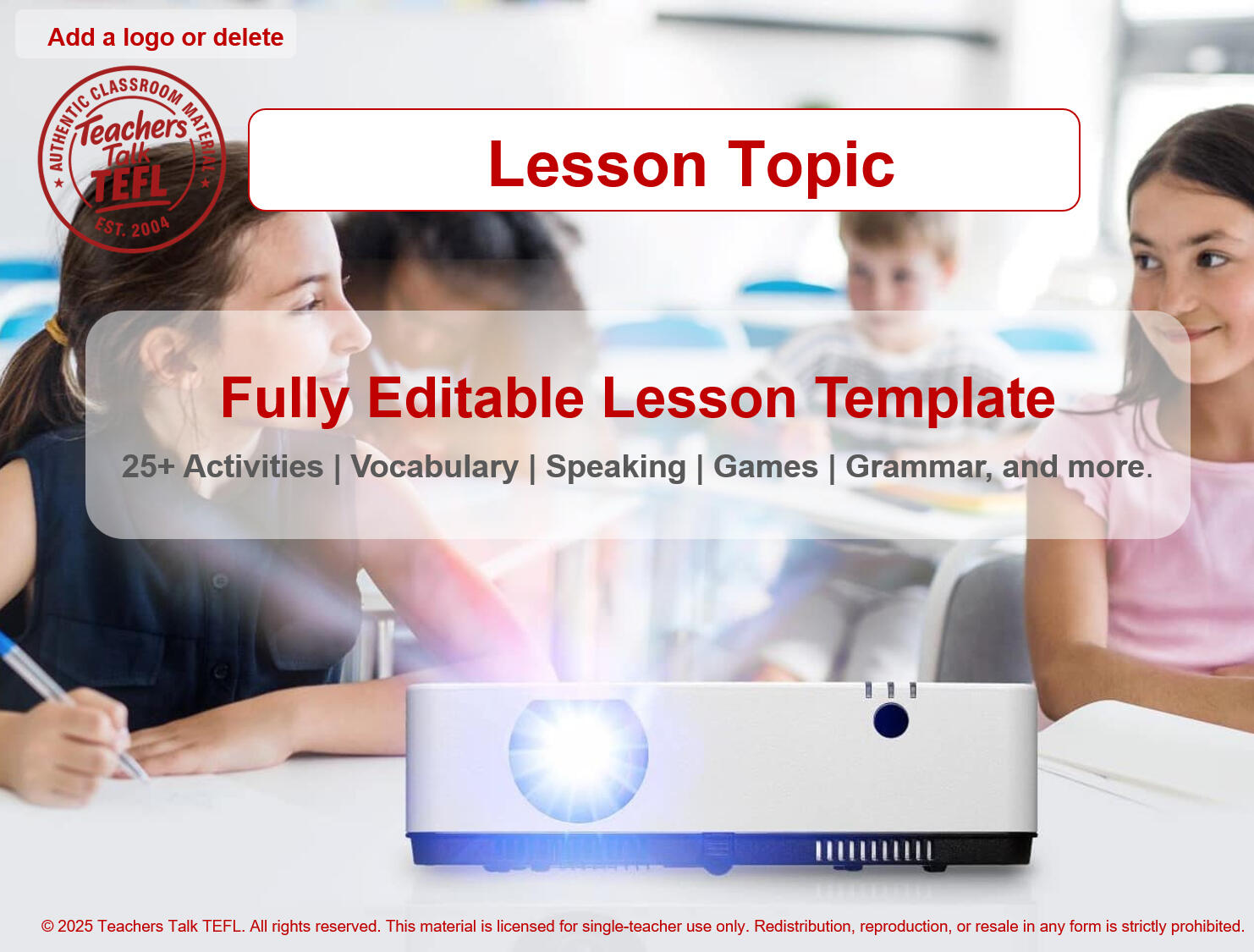Save hours of planning with this fully editable TEFL lesson template - 25 animated activity slides.